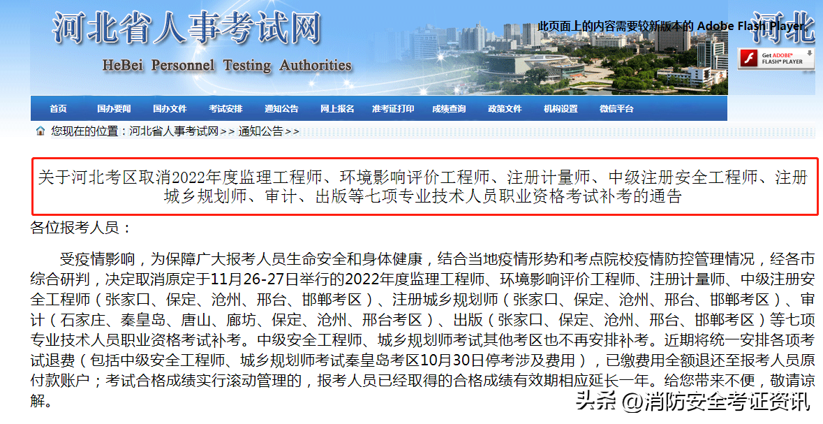 结合当地疫情形势和考点院校疫情防控管理情况,经各市综合研判,决定取消原定于11月26-27日举行的2022年度中级注册安全工程师(张家口、保定、沧州、邢台、邯郸考区)等七项专业技术人员职业资格考试补考。