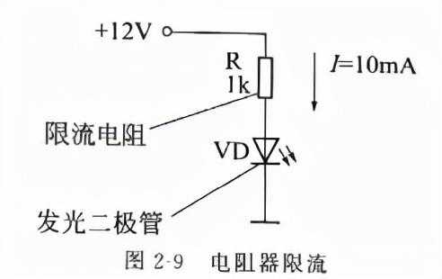 如图2-9所示发光二极管电路中,R为限流电阻。从欧姆定律I=U/R可知,当电压U一定时,流过电阻器的电流J与其阻值R成反比。由于限流电阻R的存在,将发光二极管VD的电流限制在10mA,保证VD正常工作。