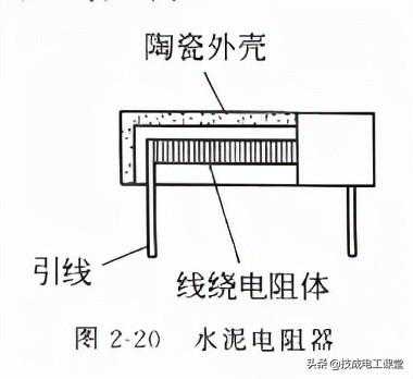 (6)水泥电阻器水泥电阻器是陶瓷密封功率型线绕电阻器的习气称谓,构造如图2-20所示。线绕电阻体放置在陶瓷外壳中,并用封装填料密封,仅留两端引线在外。