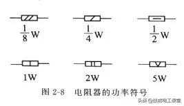 (2)额定功率额定功率是电阻器的另一主要参数,常用电阻器的功率有1/8W、1/4W、)/2W、1W、2W、5W等,其符号如图2-8所示,大于5W的直接用数字注明。