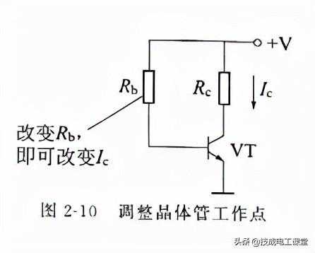 调整晶体管的工作点是电阻器用作限流的一个例子。如图2-10所示为晶体管放大电路,晶体管集电极电流Ic(工作点)由其基极电流Ib决议。改动晶体管基极电阻Rb的阻值,即可改动Ib,也就是改动了Ic,即改动了晶体管的工作点。