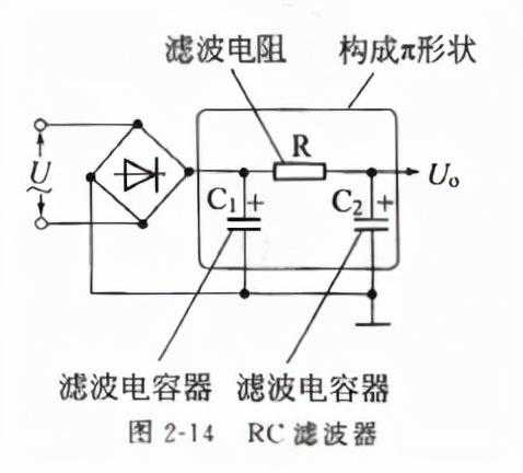 RC滤波网络是一种特殊的分压器。如图2-14所示整流滤波电路中,R与C2可了解为分压器,输出电压Uo取自C2上的压降。关于直流C2的容抗无限大,而关于交流C2的容抗远小于R,因而C2上直流压降很大,而交流压降很小,到达扩滤波的目的。