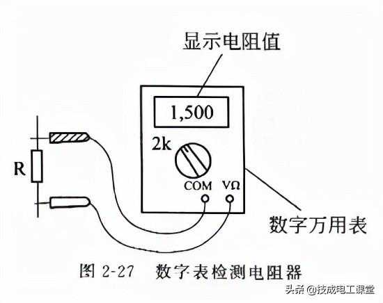 选择测量挡位时应尽量使显现屏显现较多的有效数字,普通测量200Ω以下电阻器可选“200Ω”挡,200~1999Ω电阻器可选“2kΩ”挡,2~19.99kΩ,电阻器可选“20kQ”挡,20~199.9kΩ电阻器可选“200kΩ”挡,200~1999kΩ电阻器可选“2MΩ”挡,2~19.99MQ电阻器可选“20MΩ”挡,20~199.9MΩ电阻器可选“200MΩ”挡。200MΩ以上电阻器因已超出最高量程而无法丈量(以DT890B数字万用表为例)。测量时,两表笔(不分正、负)分别接被测电阻器的两端,LCD显现屏即显现出被测电阻R的阻值,如图2-27所示。如显现“000”(短路)、仅最高位显现“1”(断路)、或显现值与电阻器上标示值相差很大,则阐明该电阻器已损坏。