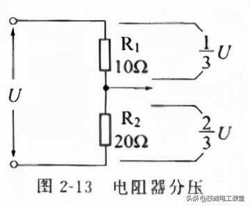 如图2-13所示,电阻器R1和R2构成一个分压器,由于两个电阻串联,经过这两个电阻的电流J相等,而电阻上的压降U=IR,R1上压降为1/3U,R2上压降为2/3U,完成了分压(负载电阻必需远大于R1、R2),分压比为R1/R2。