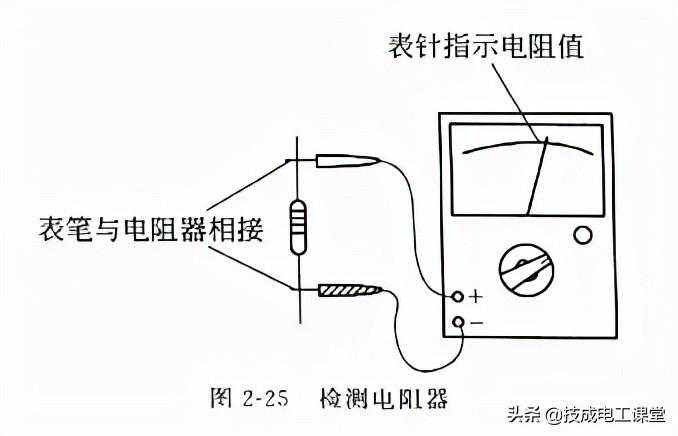 将万用表两表笔(不分正、负)分别与待测电阻器的两端引线相接,如图2-25所示,表针应指在相应的阻值刻度上。如表针不动、指示小稳定或指示值与电阻器上标示值相差很大,则阐明该电阻器已损坏。