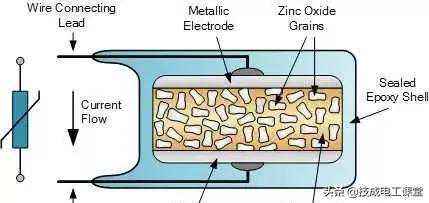 压敏电阻通常都是金属氧化物可变电阻,即MetalOxideVaristor(MOV),其电阻材料是氧化锌颗粒和陶瓷颗粒混合后一起烧结成型。MOV的特性就是当电压超过一定阈值的时候,电阻迅速下降,可以通过大电流,因此可以用于浪涌防护和过压保护。