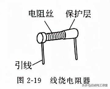 (5)线绕电阻器线绕电阻器也是较常用的电阻器之一,构造如图2-19所示。线绕电阻器的电阻体是电阻丝,将电阻丝绕在陶瓷骨架上,衔接好引线,外表涂覆一层玻璃釉或绝缘漆即制成线绕电阻器。
