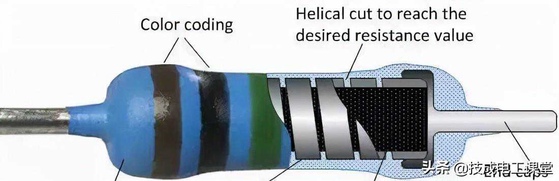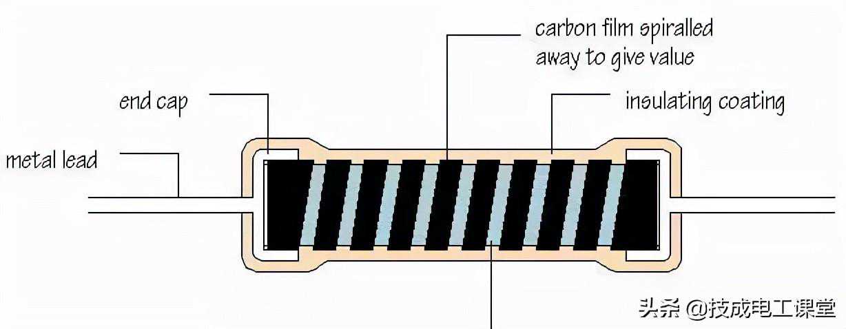 碳膜电阻主要是在陶瓷棒上形成一层碳混合物膜,例如直接涂一层,碳膜的厚度和其中碳浓度可以控制电阻的大小;为了更加精确的控制电阻,可以在碳膜上加工出螺旋沟槽,螺旋越多电阻越大;最后加金属引线,树脂封装成型。碳膜电阻的工艺更加复杂一点,可以做精密电阻,但由于碳质的原因,还是温度特性不太好。