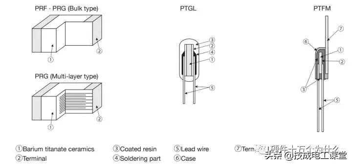 陶瓷PTC,其电阻材料是一种多晶体陶瓷,是碳酸钡、二氧化钛等多种材料的混合物烧结而成。PTC温度系数具有很强的非线性,当温度超过一定阈值时电阻会变得很大,相当于断路,从而可以起到短路和过流保护的作用。