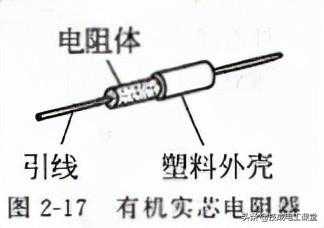 (3)有机实芯电阻器有机实芯电阻器构造如图2-17所示,其电阻体是用炭黑、石墨等导电物质粉末,混合有机黏合剂制成的实芯圆柱体,两端加上引线,外面有趣料外壳。