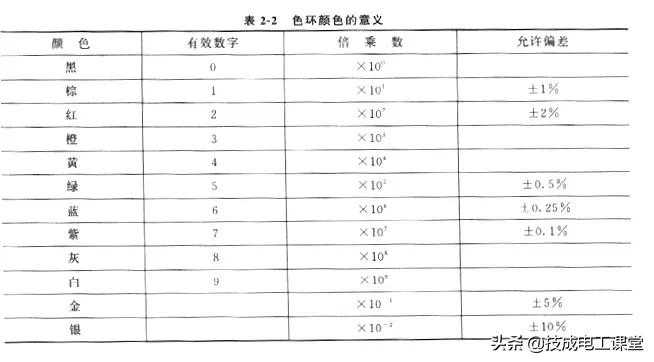 色环普通采用黑、棕、红、橙、黄、绿、蓝、紫、灰、白、金、银12种颜色,它们的意义见表2-2。例如,某电阻器的4道色环依次为“黄、紫、橙、银”,则其阻值为47kΩ,误差为±10%。某电阻器的5道色环依次为“红、黄、黑、橙、金”,则其阻值为240kQ,误差为+5%。