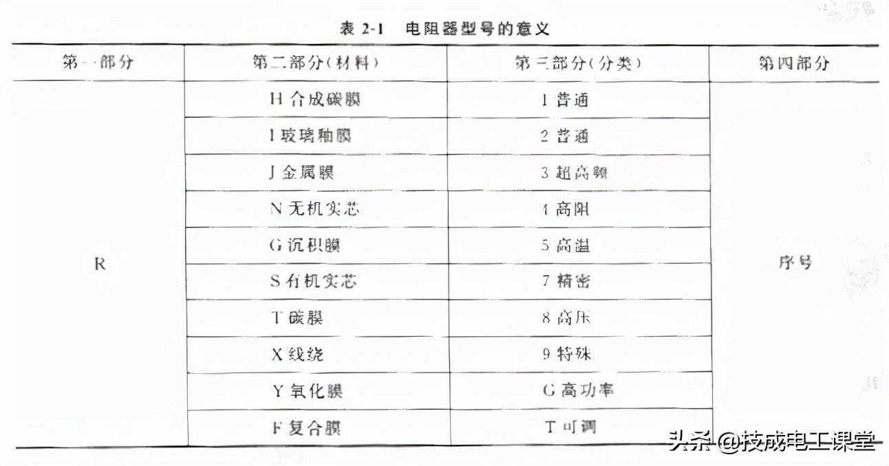 第一局部用字母"R"表示电阻器的主称,第二局部用字母表示构成电阻器的资料,第三局部用数字或字母表示电阻器的分类,第四局部用数字表示序号。电阻器型号的意义见表2-1。