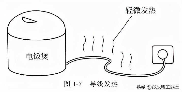 任何物体都存在电阻,导体也不例外。大家可能有这样的体验,电饭煲在煮饭的时分,导线会有些许发热,究其缘由就是由于制造导线的铜存在电阻,固然电阻很小,但是在煮饭的大电流状况下仍会耗费局部电能,以热的方式分发出来,如图1-7所示。