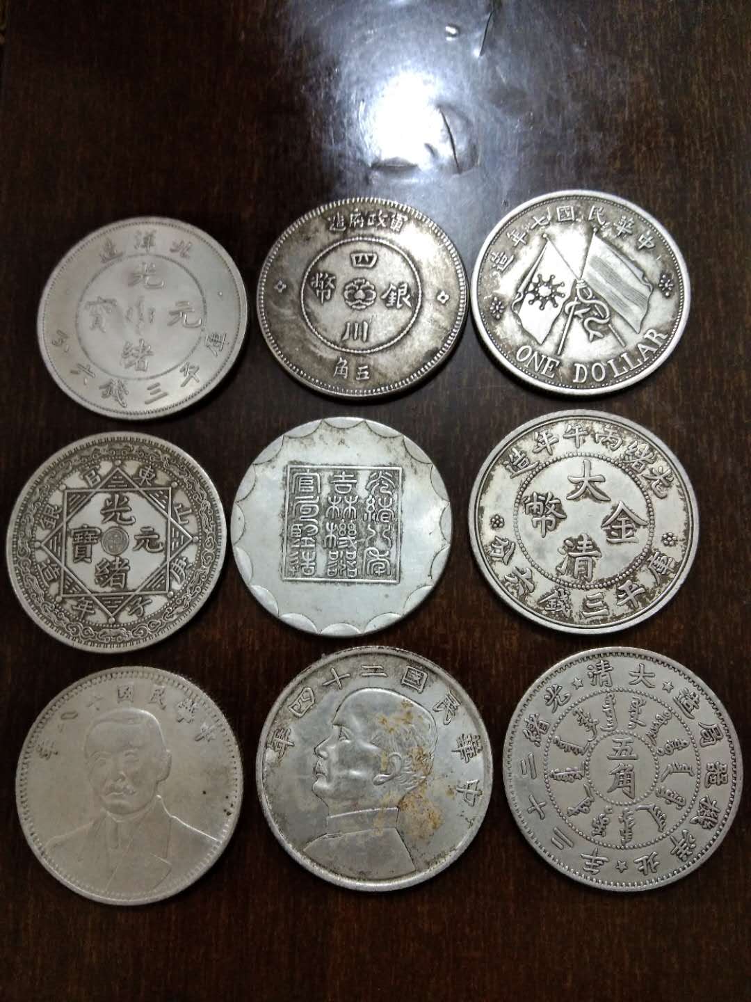 这九枚钱币包浆自然,底光柔和,银光温润,所谓包浆是自然形成的氧化层,也有人为手盘包浆,两者不同,但同时都有保护钱币的功能,有如给钱币镀上一层保护膜,使钱币不再氧化,便于收藏传世,如果觉得钱币脏,可以用清水洗,再用棉布擦干,不要破坏包浆,破坏了包浆就相当于破坏了保护层,更重要的是包浆是鉴定新老钱币最简单有效的方法。细看这九枚钱币品相完美,没有磕缺,损毁,变形等是不可多的收藏级钱币,建议收藏,传世。