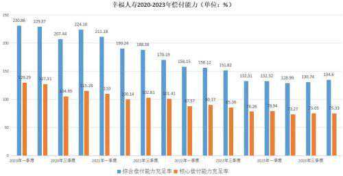 另外,从偿付能力看,幸福人寿也在走下坡路。相比较2020年初,其综合/核心偿付能力充足率下降了42%。