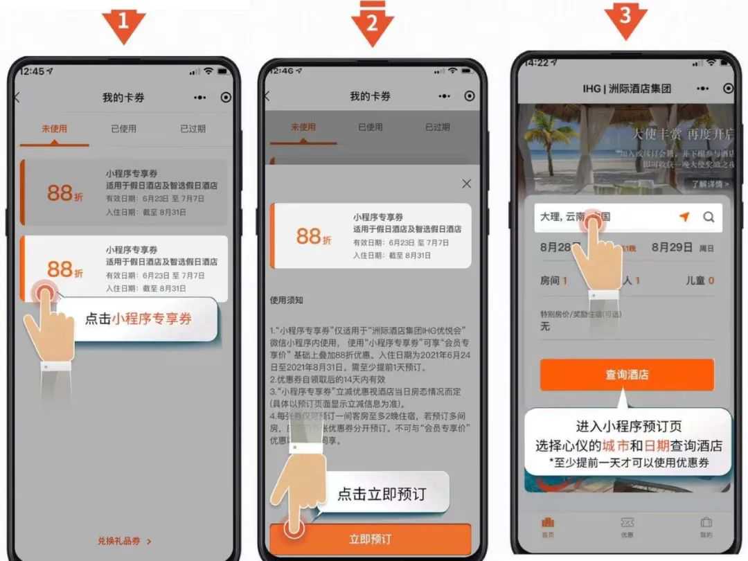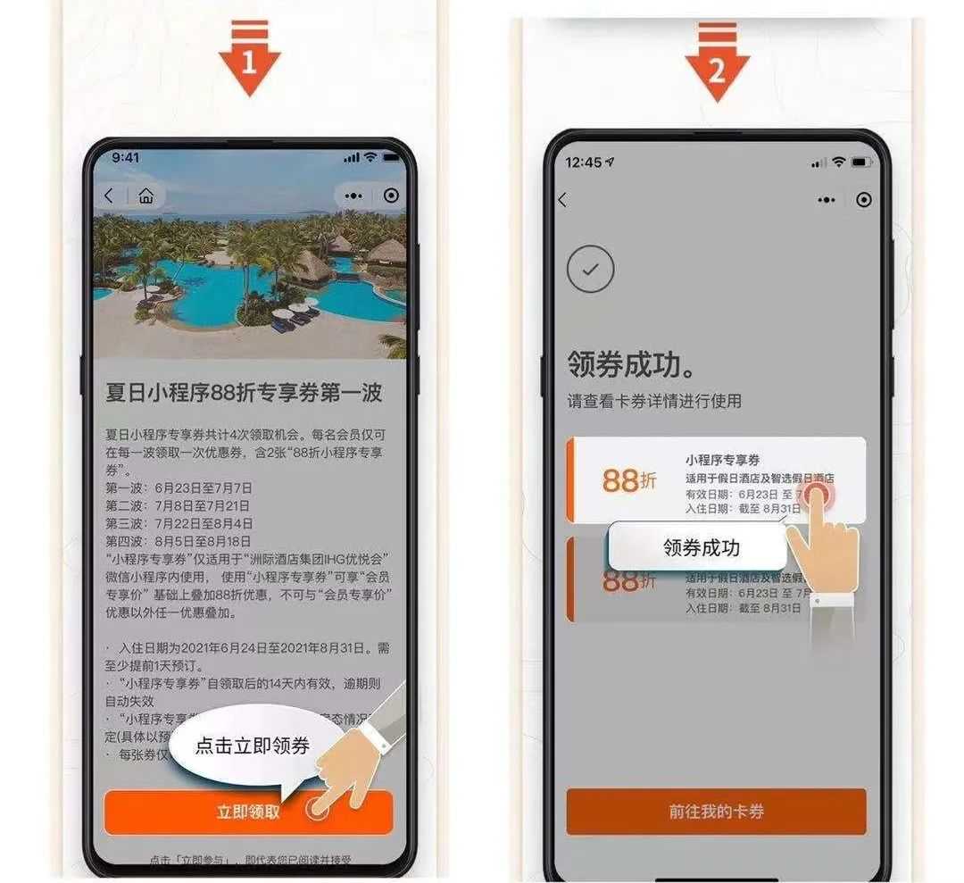 每个账号每次可以领一套88折券(HolidayInnExpress和HolidayInn各一张),领券后14天内使用有效,14天后每个账号还可以再次领,整个活动期内6月23日、7月8日(今天)、7月22日、8月5日一共可以领4次券。至少提前1天预订酒店,这次有300多家大中华区的HolidayInn和智选假日参与活动。