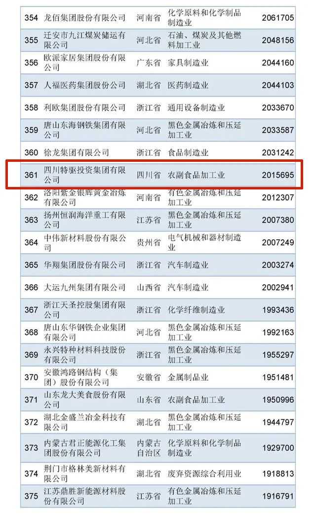 特驱集团荣列“中国制造业民营企业500强”第361位。