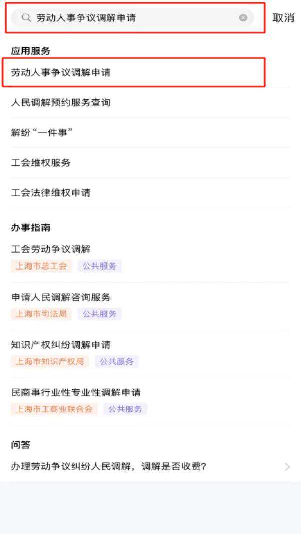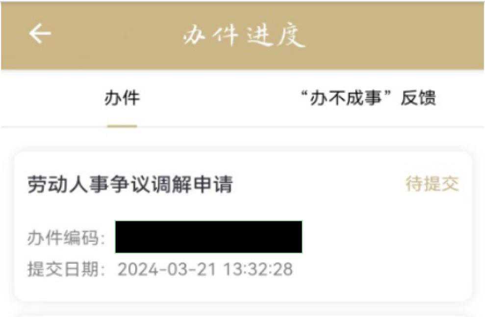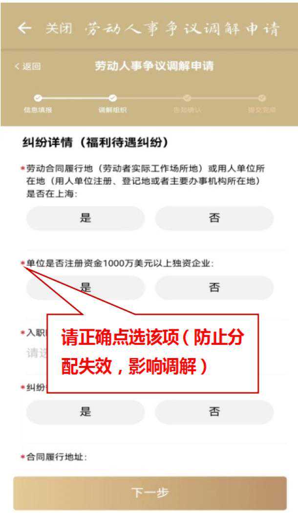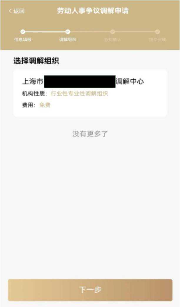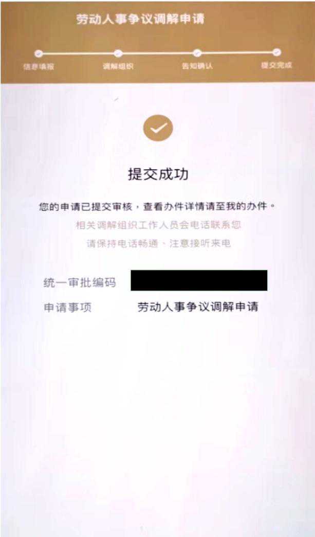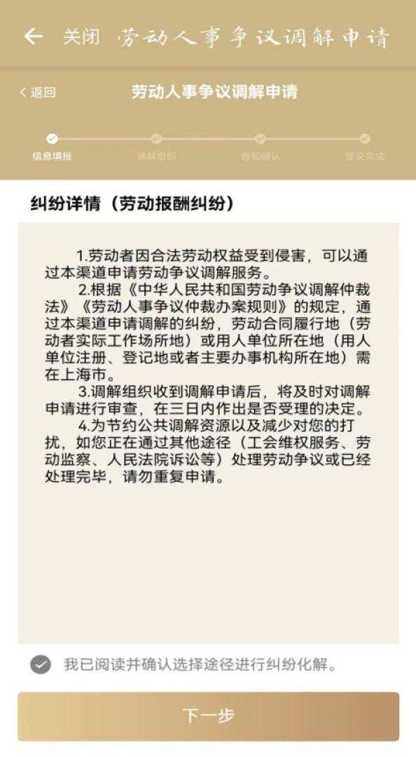 在线申请劳动人事争议调解→进行【信息填报】→选择【调解组织】→收到【告知确认】→最后【完成提交】