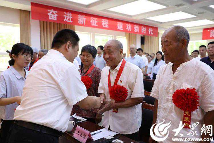 河山镇党委书记王纪来为光荣在党50年老党员代表颁发纪念章。