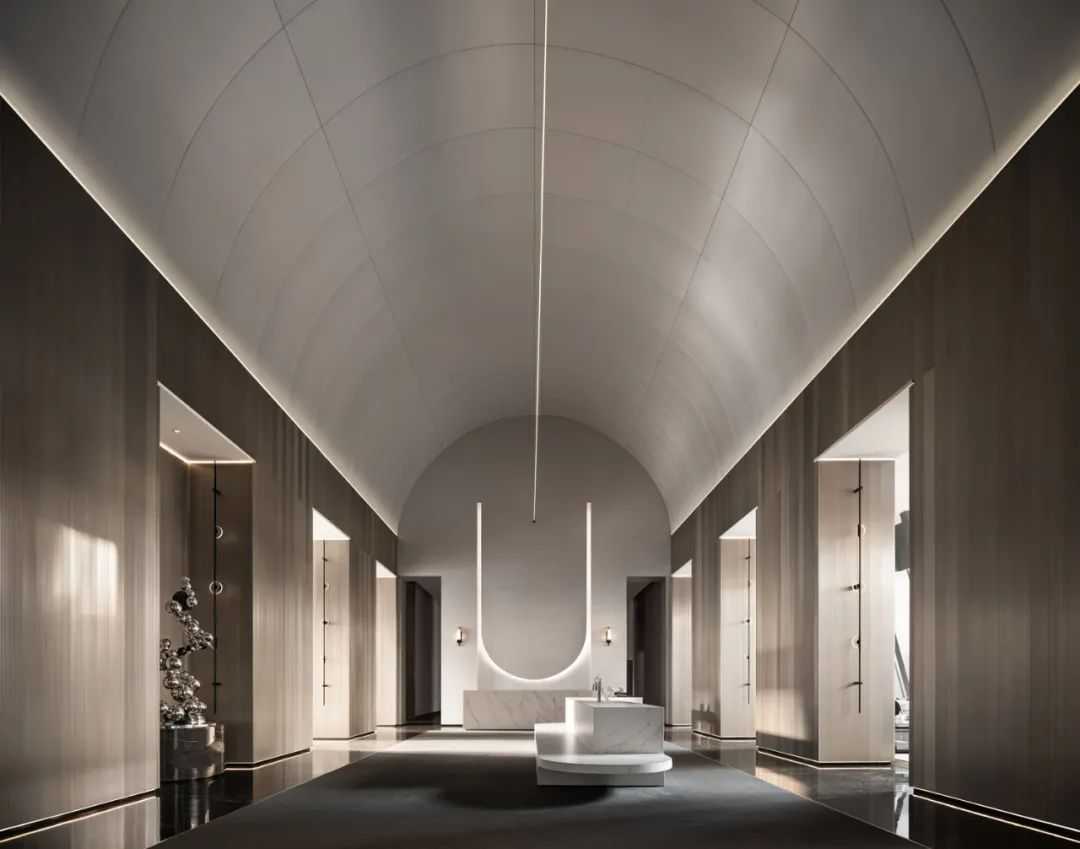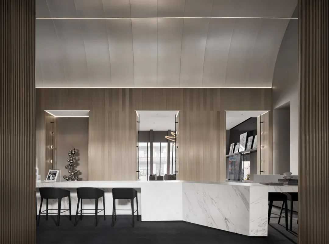 原建筑及其室内以汉唐文化脉络表达销售住宅的空间,而本次销售厅改造是以销售商务公寓为目的,让室内空间不受建筑风格的影响,同时也不受区域维度的影响和时间维度的影响,为此本案先定格当代,设计上抛弃原室内各种碎片化的元素和关系,采用符合当代审美的序列来表达,梳理各种边界的关系找到共融点。设计师作为文化传承者,如何引领多元的艺术形态实现当代美学空间,是很多设计师都执着于钻研与实践的课题,我们在此次西安西派国际销售厅的改造设计中,对艺术形态的思考亦体现在空间之内。