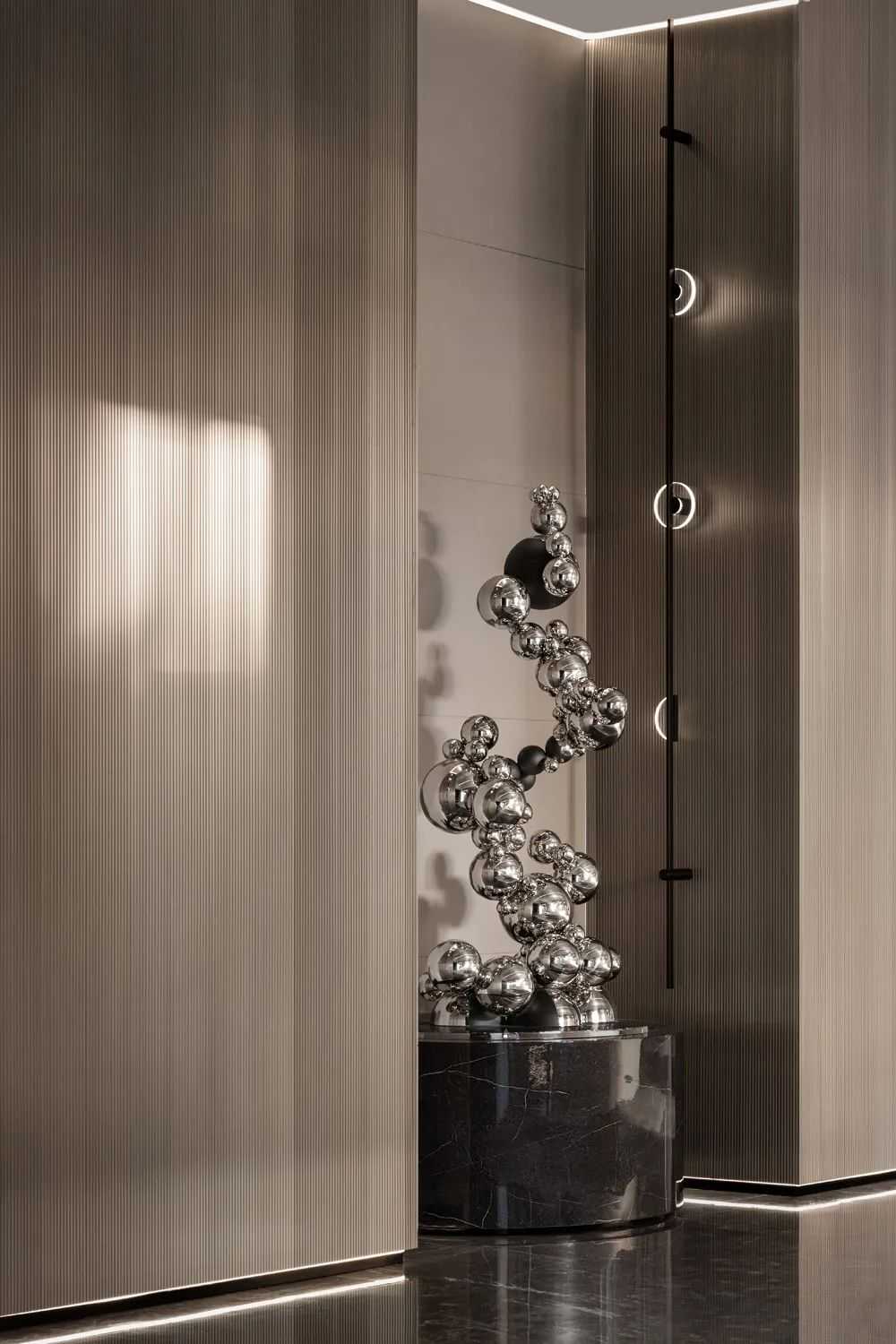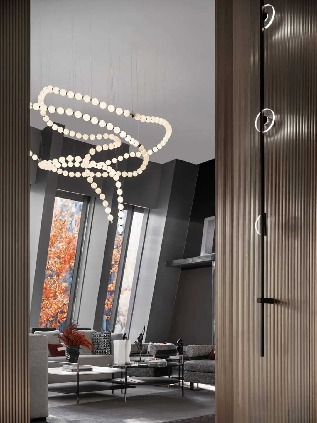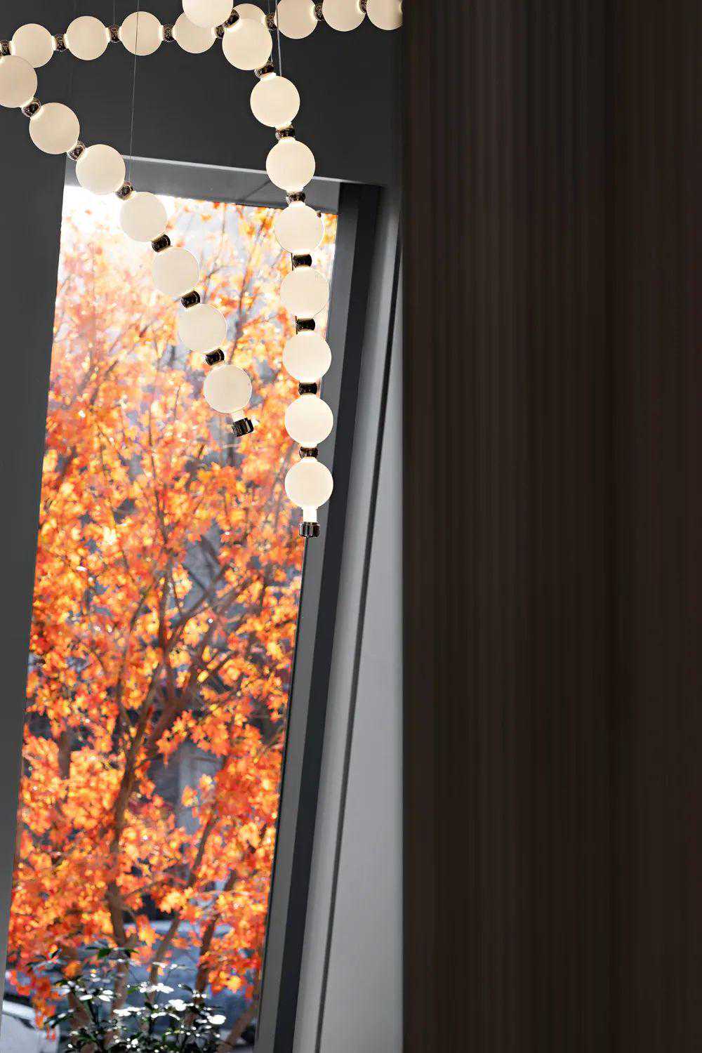 VIP洽谈区的无规则造型吊灯是由设计师以水晶球为主要元素,通过独特的排列方式组合而成,与前厅的艺术雕塑遥相呼应。忽而,明媚的光线从窗外涌入,仿佛为整个空间点亮了灵魂——它瞬间灵动了起来。此空间的仪式感、体验感与节奏感变得井然有序,意在刻画出一方回归生活本真的精神人文空间,勾勒出时光的韵脚,折射新生活的未来场景。
