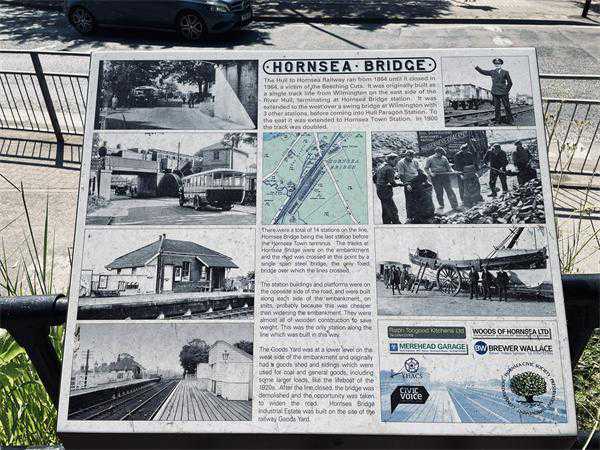 19世纪,英国对火车的热衷到达了狂热地步,铁路路网极速扩张,一战前到达了巅峰,线路总长达三万七千多公里。之后,随着公路修建和私家车普及,火车旅行渐渐被抛弃,一些不常用的线路被关停。20世纪60年代,英国物理学家暨工程师理查德·比钦(RichardBeeching)出具了两份报告,指出有两千多座火车站和八千多公里线路应该关闭,虽然很多人反对,但英国铁路局还是进行了大规模线路削减行动。赫尔至霍恩西的铁路线就在这期间关停。不过,曾经的铁路现在被改建为绿荫道,最后一程的入口就在湖岸巷的转角,走上一小段楼梯,可以看到展示霍恩西桥车站历史照片的标牌,然后就是曾经的铁路线了。比较遗憾的是铁轨并未被保留下来,而是完全改建成了更方便骑行和跑步的平路,每隔一小段,路边就会立一块告知英里数的牌子,我们选择往东北方向走,那会通往过去铁路线的终点站:海边的霍恩西站;而往反方向,沿着步道不仅可以走到(或者骑行到)赫尔,还可以接入“跨奔宁山脉路径”(TransPennineTrail),这是一系列横贯英格兰北部的步道/骑行道,最终可以抵达位于英格兰西海岸的利物浦。整个路径几乎都是对关停铁路线的再利用,铁轨虽然不再,但通过沿线的历史展示,人们依然有机会通过行走触及往昔。
