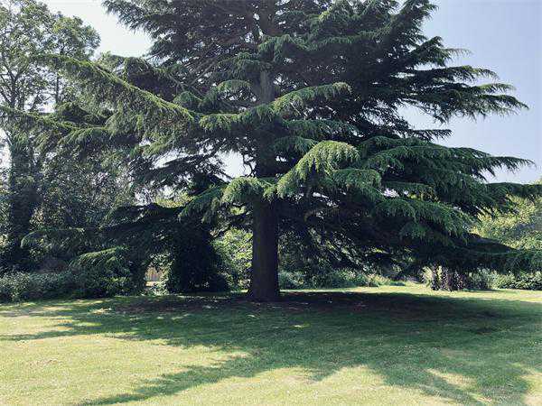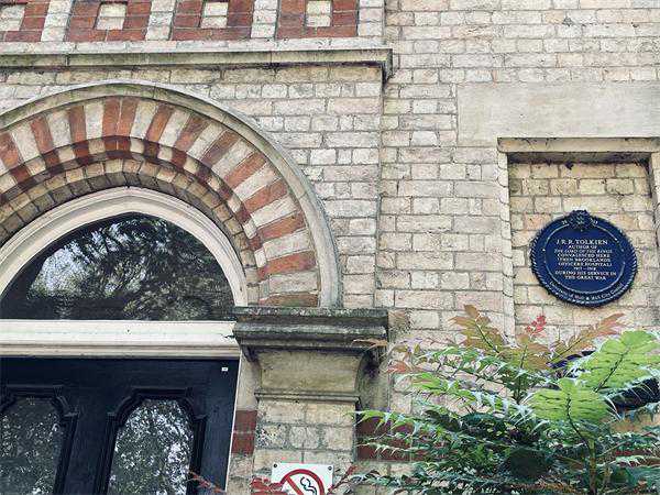 科廷厄姆路倒是绿树成荫,这里靠近赫尔大学。下车走几步,藏在几棵树后面,是一座两层的漂亮小楼,主体是黄褐色的砖墙,拱形门楣有红砖装饰,完整保存了19世纪中叶维多利亚时期的建筑风格。远远看到,建筑外墙上似乎有个蓝色圆牌,走近看,它真的纪念了托尔金曾在此养病的事实,这让我们意外又兴奋。在英国,常常会看到公共建筑或私人房产外墙挂有圆形蓝色铭牌(也可能是其他颜色和形状),用来纪念该地点与某个著名事件或人物之间的关联,最“正规”的是由英格兰遗产协会制作的蓝牌,但各地方政府和其他民间机构也可以成为悬挂蓝牌的主体,比如这块2013年揭幕的牌子落款便是赫尔大学和赫尔市议会(HullCityCouncil)。行前在网上查阅的资料显示,这一建筑是赫尔大学的丹尼逊中心(DennisionCentre),但凑近看,门窗上都结了蛛网,似乎很久未曾有人使用。室内是进不去了,沿着建筑外墙绕到后面,就到了原本的庭院。花坛里白色月季绽放,常青藤刚开始攀上墙面,建筑另一边的门面对一大片草坪,似乎刚被修剪不久。最让人赞叹的是草坪中央的一棵雪松,巨大的树冠投下清凉,看其粗壮的树干推算,托尔金在此疗养的时候,她应当已然亭亭立在这里了。