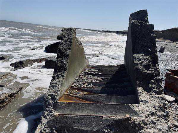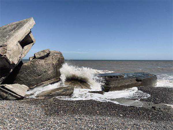 从威瑟恩西坐半小时巴士到小村子艾辛顿(Easington),然后就只能靠双脚了,沿着沙滩往南走五公里左右,就是1915年启用的戈德温炮台(GodwinArtilleryBattery)的遗址。这里虽然也有度假公园,但海滩上几乎不见人影,偶尔会路过一个钓鱼的人。这里的海滩由沙砾和鹅卵石构成,比预想得难走一些,却是捡石头爱好者的天堂,每一块石头都有着不同的花纹,如果留心,甚至还有可能找到菊石,这或许是从更靠北的白垩地冲刷至此。海岸线上其实有好几处混凝土构筑,半掩在沙中,或者已经被正在上涨的潮水淹没,很可能是一战期间沿海防御工事的一部分,但规模都不算大。右手边,黏土崖壁缓缓抬升,突然远处出现了大体量的混凝土结构,若是从空中,会看到一座倾斜的方台和一个巨大的四分五裂的圆形构筑物,地图定位显示,戈德温炮台到了。走到近前发现,这些混凝土构件像是被巨人捶打又堆叠在一起,足有三四米,海浪撞击在其粗糙的表面,溅起比人高的水花。这个场景有种狂暴的美感,虽然将战争的遗迹描述为“美”似乎并不那么恰当。关于1917年末托尔金在基恩西驻扎的细节并没有什么资料,作为通信官,他或许不需要实际操作那些大炮,但无疑会见过炮台完整的样子。这里并没有关于历史的文字介绍牌,炮台遗迹边,黏土悬崖上露出彩色的小房子,原来又是一处度假公园,那些在这里休憩、娱乐的人们,是否会想过,曾经这里有过一种更“要命”的营地?