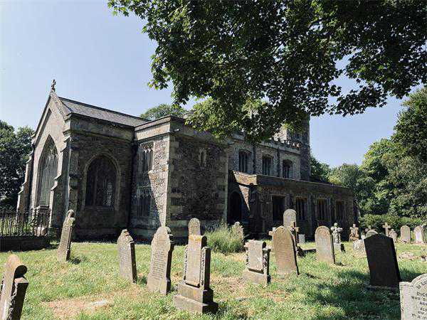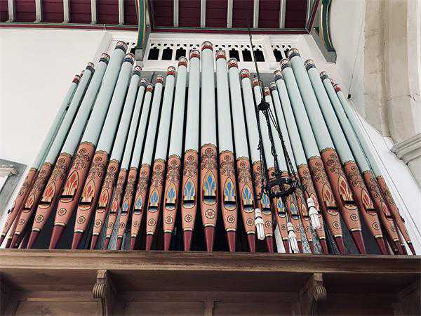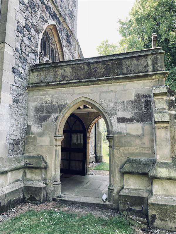 鲁斯村只有一条主干道,沿着它往南走,路过一些联排房屋和独栋别墅,拐上砂土步道,一侧是田野,另一侧细细的铁丝网内就是树林了。继续往前走,穿过一道铁门,诸圣教堂出现在眼前。目前的教堂建筑始建于13世纪,当然在漫长岁月中其式样被多次更改,周围草地上散布着年代参差的墓碑,其中一些早已字迹模糊。当然,在20世纪初这里应当已经属于英格兰教会(新教),因此天主教信仰的托尔金或许不会在教堂内祷告,但建筑本身无疑会吸引他的注意,尤其是西侧的塔楼,顶上还有类似城垛的防御结构。正门也在西侧,若是沿大路绕到这边再进来,便会走过一段两侧紫杉伫立的庭院小径,爬上一小截楼梯,才来到带拱的门廊下。中午并不是做礼拜的时间,整片区域十分安静,但刚好有教会的志愿者来开门,以便电力工作人员检修,我们便有机会进入教堂之中。据这位志愿者说,20世纪80年代之后,教堂有30多年都无人使用,建筑局部已经开始坍塌,直到2016年,鲁斯的村民自发找到了资金,将这里修缮并重新开始在此祷告。内部空间不大,一排排木质长椅朴素但整洁,比较特别的是讲台右侧的管风琴,上半浅蓝,下半褐色,还绘制了图案,志愿者提到,这颜色根据残留的旧漆完全复原。