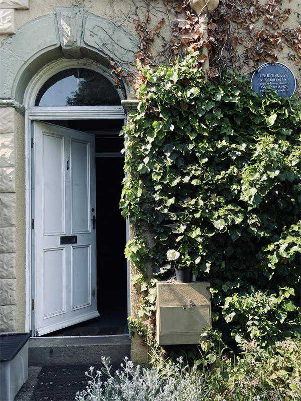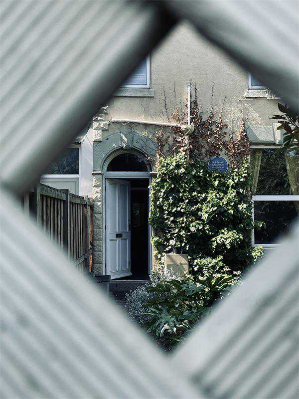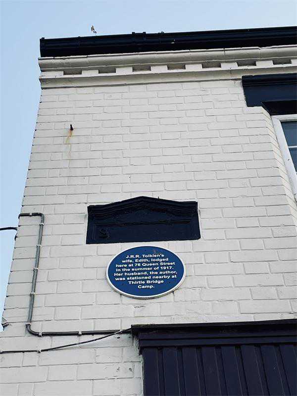 霍恩西如今是一个颇为热闹的海滨度假城市,规模比威瑟恩西更大,从前那些军营早就无迹可循,但伊迪丝住过的房子依然存在。从市中心的博物馆、咖啡馆出发往南走,大约一公里即可到湖岸巷(BankTerrace)1号,一幢米黄色的联排别墅小屋,现在依然是私人住宅,透过一人高的白色围栏,可以看到院内花木繁茂。白色房门边上,爬山虎占据的屋墙上透露出蓝色圆牌。凑在围栏缝隙拍照时,我们不小心碰开了院门,然后惊恐地发现这家的男主人端着午餐走了出来!不过他倒并未介意我们的近乎私闯民宅,听闻我们对托尔金的兴趣,还邀请我们进到院子里拍照。根据这位屋主描述,他们刚搬来时并没有这块托尔金纪念蓝牌,2013年他们一家出门度假,回来时却惊奇地发现墙上多了这么一个牌子。不过,我觉得或许屋主在此过于戏剧化了,毕竟,蓝牌的落款是霍恩西市民公会(HornseaCivicSociety),这是一种能够参与地方规划讨论的自发民间机构,我不认为他们有权自行进入私家院子去挂牌。伊迪丝选择这里落脚并非偶然,一个多世纪前,这房子毗邻霍恩西桥火车站(HornseaBridge),这是赫尔至霍恩西铁路线上的倒数第二站,若是托尔金真的在海边的军营常驻,她便能方便地坐一站火车去与他团聚。
