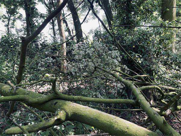 林木茂盛,沿着草坪几乎找不到“入口”,得弓着身子钻过交错的树枝,阳光照在一丛丛半人高的野芹上,虽然已过了最盛的花期,草本的植株有些倒伏,依然有大片伞状花序的白色小花在微风中摇曳。林间没有路径,只能顺着草木稍稍稀疏的地方往里走。在卫星图上看着的一小片林子,走进去却感觉幽深。行到一块稍显开阔的林间空地,前面似乎也再无落脚之处了,我们就停下来,朋友弹起琴,吟唱《魔戒》中阿拉贡在风云顶附近给四个霍比特人唱的那首《缇努维尔之歌》。或许这才只是林子的边缘,偶尔可以听到外面停车的声音,有人走下来,但那些外面的声音显得遥远。我们感觉进入了三重叠加的时空:当下;1917年托尔金夫妇散步的时刻;以及多瑞亚斯林间明月初升的傍晚。在《精灵宝钻》中,托尔金如此描述凡人贝伦与精灵少女露西恩首次相遇的场景——