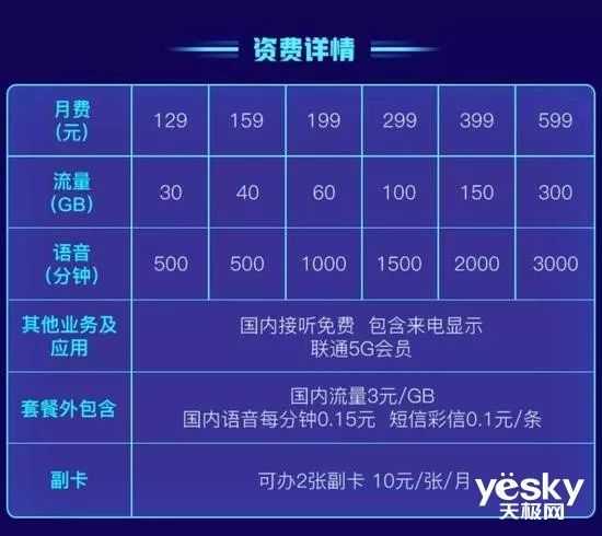 中国联通的畅爽冰激凌5G套餐价格每月129元起,共分为129元/159元/199元/239元/299元/399元/599元档位,其中:
