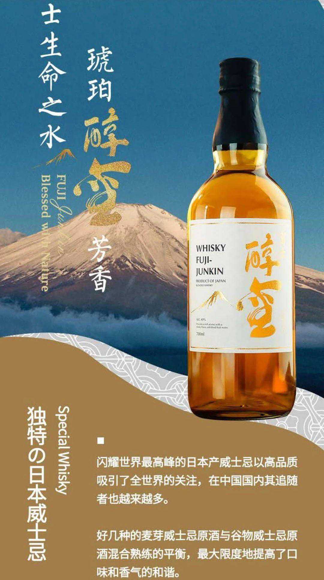 富士醇金——威士忌品牌,选址于富士山脚下建立酿造工厂,选用富士山纯粹且洁净的雪融水作为水源(水质硬度55mg/L,pH值约7.8~8,属弱碱性),结合现代化改良精酿,酒香清淡宜人的同时诠释顺滑绵延,温润的口感更适合东方人的味蕾,细致柔和的风味使入口更觉亲密感。其拥有18年、15年、12年的年份威士忌酒和调和威士忌及highball、梅酒等产品系列。