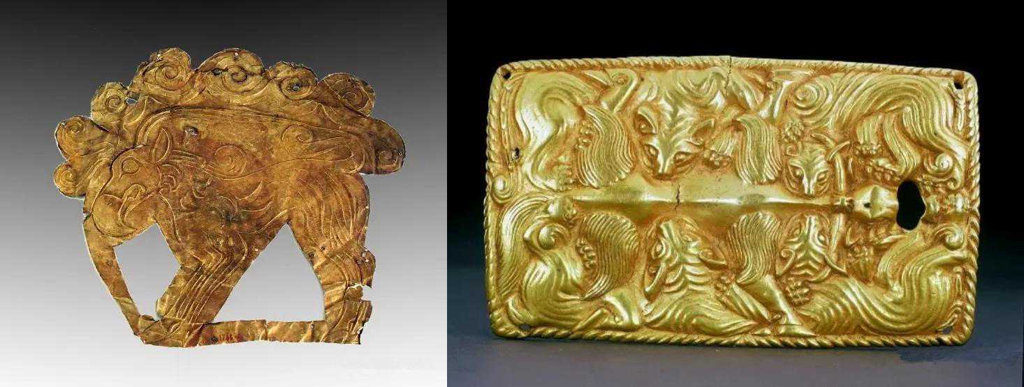 △左为直立怪兽纹金饰件,藏于鄂尔多斯青铜器博物馆。右为虎咬牛纹金带饰,藏于内蒙古博物院。