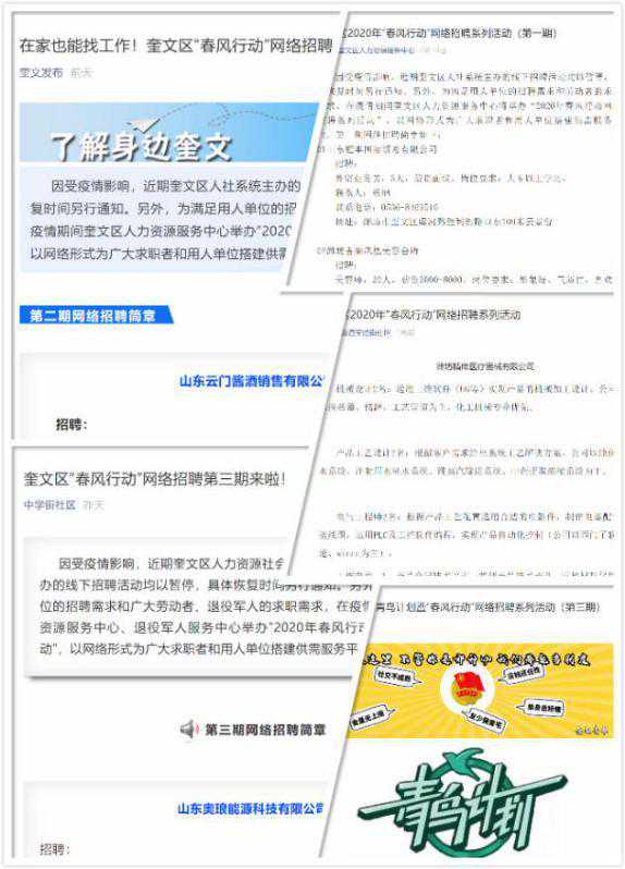 发挥线上招聘“乘”倍效应稳就业。组织举办“就业服务不打烊、网上招聘不停歇”的春风行动系列线上招聘活动,通过电话、微信平台、创业园区宣传等方式广泛收集用工信息,在山东公共招聘网、“奎文发布”和“奎文区人力资源服务中心”公众号、社区居民群等发布招聘简章3期,组织天佑德建设咨询有限公司、潍坊瑞亨缘运输有限公司等86家企业提就业岗位2226个,涉及教育、环保、文化传媒、商贸流通、餐饮服务等20余个行业领域。同时,积极联合团区委、区退役军人事务局分别向大学生、退役军人等重点就业群体精准推送,达成就业意向160余人,充分发挥了就业招聘“线面”结合的“乘”倍效应。