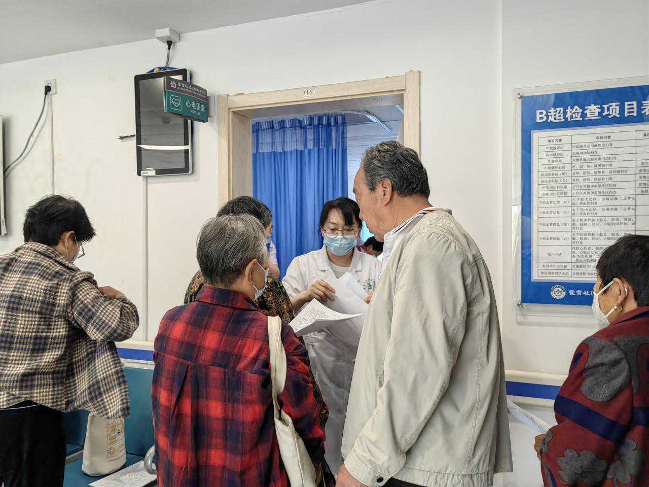 体检现场,志愿者们协助做好引导,医护人员则认真细致地为每位参加体检的老年人提供血常规、尿常规、肝肾功能、血糖血脂、一般体格检查、心电图、B超等多项检查。