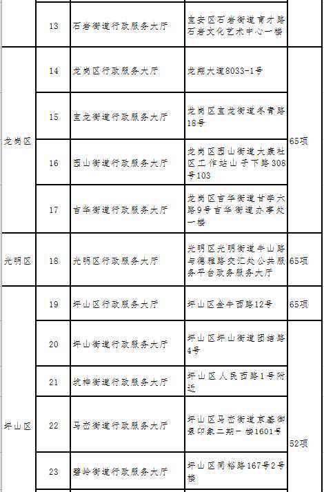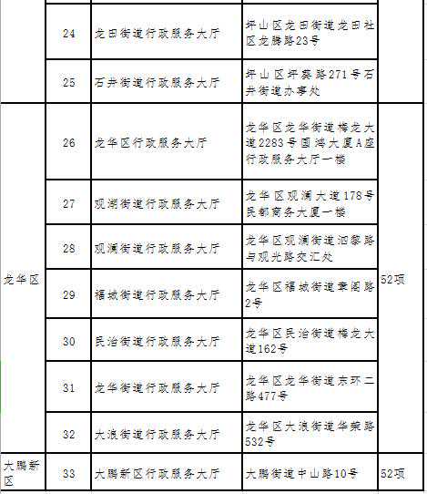 为实现社保业务"就近办",我市社保部门加快了推进社保业务进驻政务服务大厅的步伐,继首批进驻27个政务服务大厅后,最近又陆续新进驻6个,分别是罗湖区行政服务大厅、光明区行政服务大厅、龙岗区行政服务大厅、龙岗区宝龙街道行政服务大厅、龙岗区园山街道行政服务大厅、龙岗区吉华街道行政服务大厅。