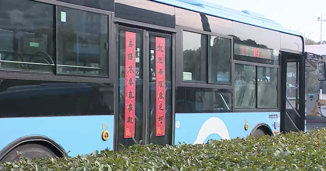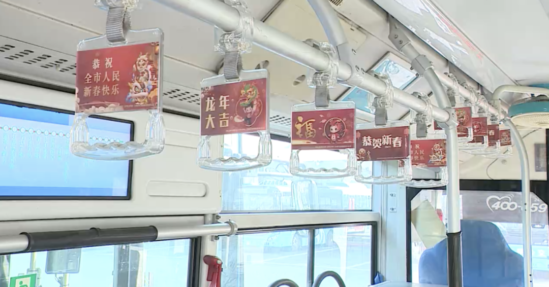 在公交总站,记者看到,公交车外大大的春联传递出浓浓的年味。车厢内,“恭贺新春”“龙年大吉”等祝福语的挂饰传递出喜庆和祝福。