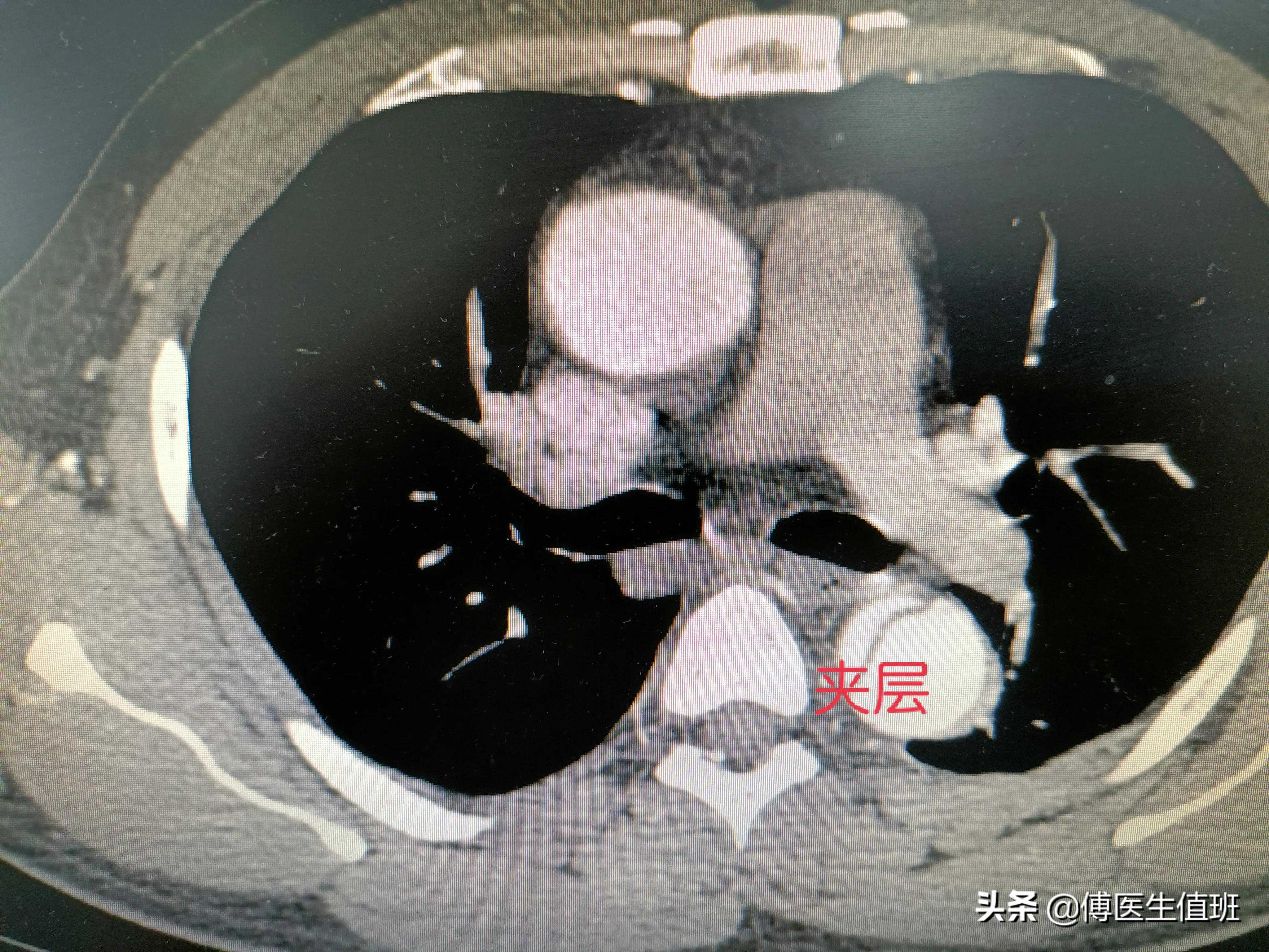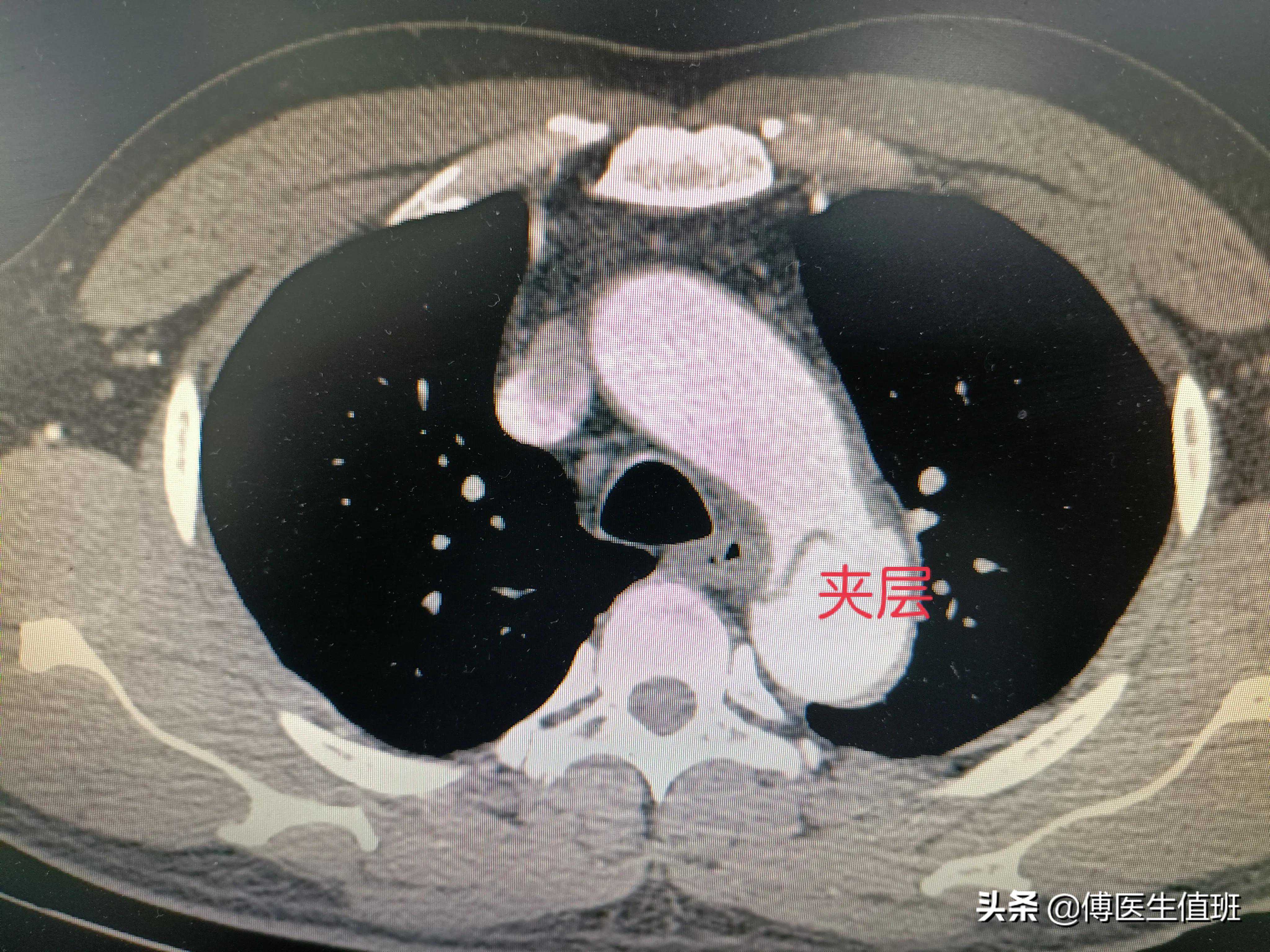 主动脉明显增粗,应该是夹层,你看这里,主动脉壁两个层面,没错,是主动脉夹层。