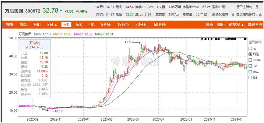 从2023年下半年开始,万辰集团股价便有了下行的趋势,2024年开年其连跌5天。