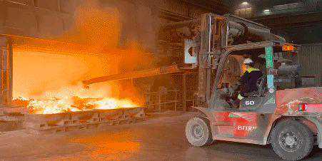 在格朗吉斯铝业(上海)有限公司的熔铸车间内,火花飞溅,热流滚滚,千余摄氏度的熔铸机内闪烁着火苗,把整个车间映得通红。
