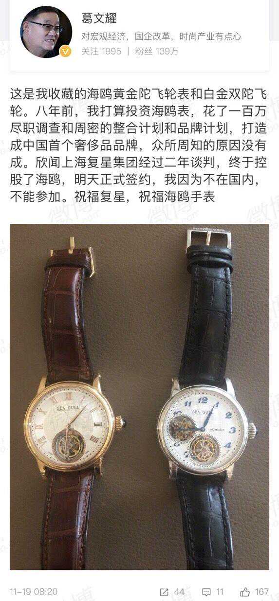 红星新闻从葛文耀最新的微博发现,他晒出了自己收藏的两块海鸥手表,并说:“八年前,我打算投资海鸥表,花了一百万尽职调查和周密的整合计划,众所周知的原因没有成……祝福复星,祝福海鸥手表。”