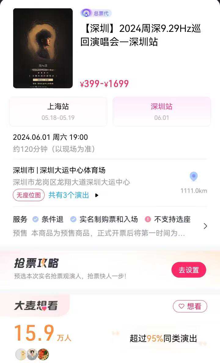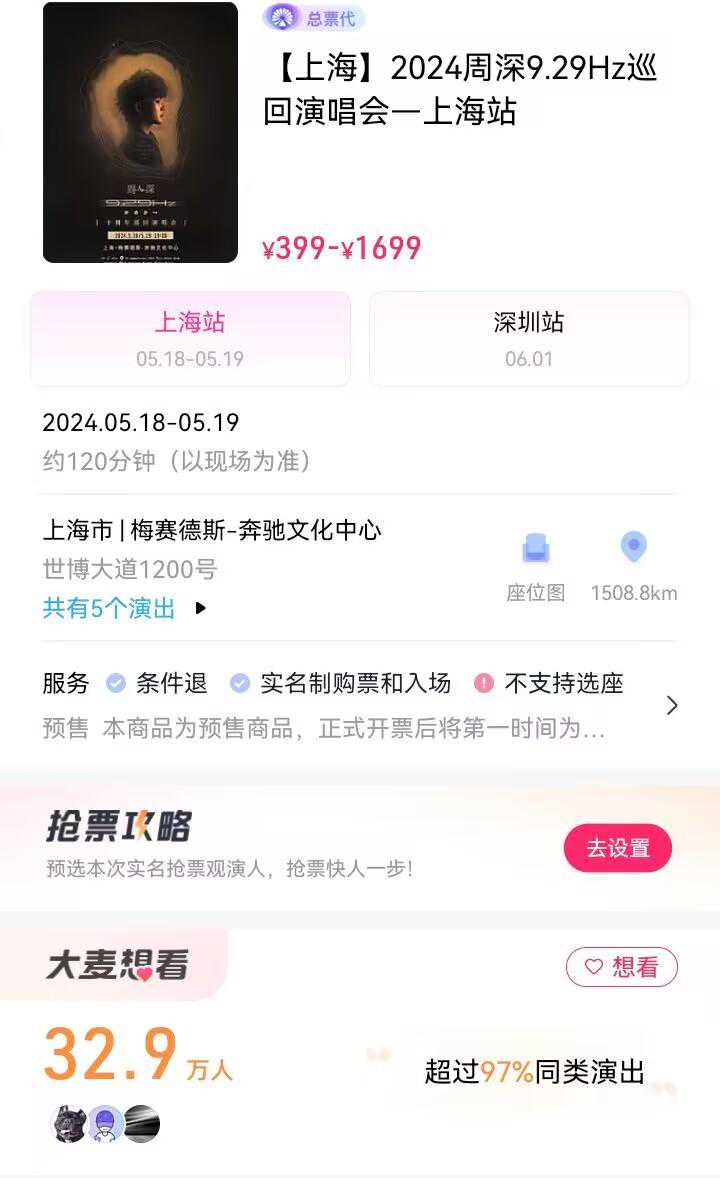 上海站目前的想看人数为32.9万人,这个数据后续还会继续增长,并且由于是排序第一的场次,上海站是有希望能够在正式开票的时候突破50W的。