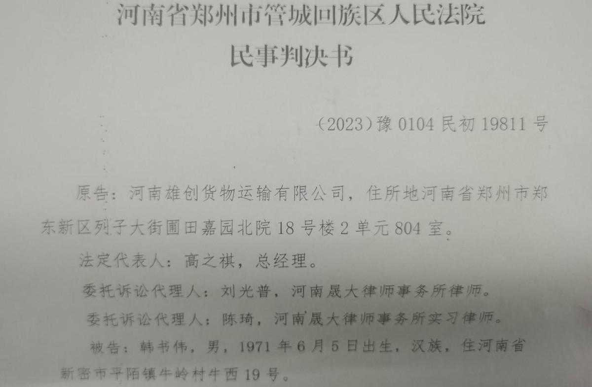 本以为自己是一场维权讨薪行动,事后没多久,韩书伟就被雄创货运告到了郑州市管城区人民法院。