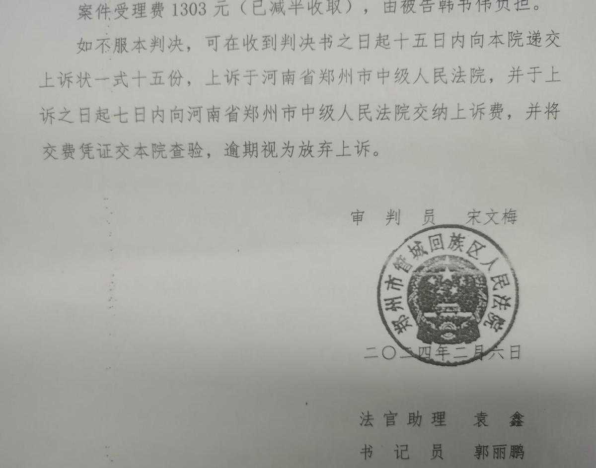 2024年2月6日,管城区人民法院在韩书伟缺席出庭的情况下,依法作出了(2023)豫0104民初19811号民事判决。判决书认为,韩书伟在2022年11月6日到达安阳卸货点时拒绝卸货,并以此要求雄创货运支付运费,而且包含软通供应链拖欠的19452元。雄创货运通过微信告知韩书伟,2022年2月至5月雄创货运并未与郑州邮区中心建立运输合同关系,也不是郑州-安阳线路的承运方,没有替软通供应链支付运费的义务,但韩书伟置拖延邮件送达时效的公共利益于不顾,致雄创货运受到郑州邮区中心每天2万元的考核罚款。据此判令韩书伟退还原告支付的运费52952元,并赔偿原告经济损失(郑州邮区中心三天的考核罚款)6万元,共计112952元。