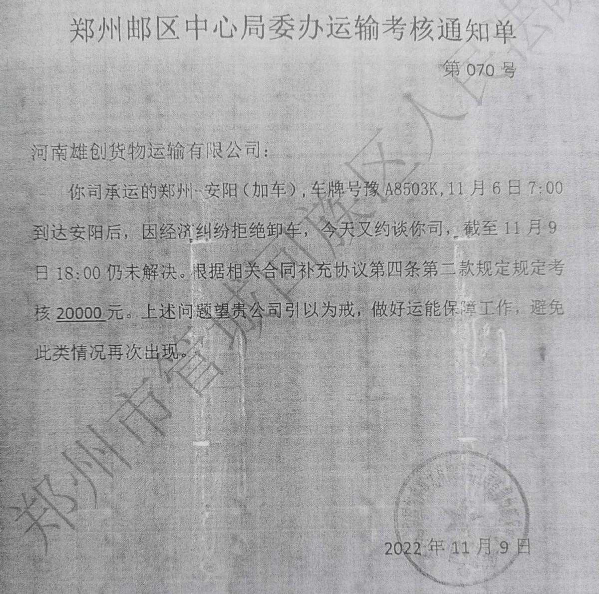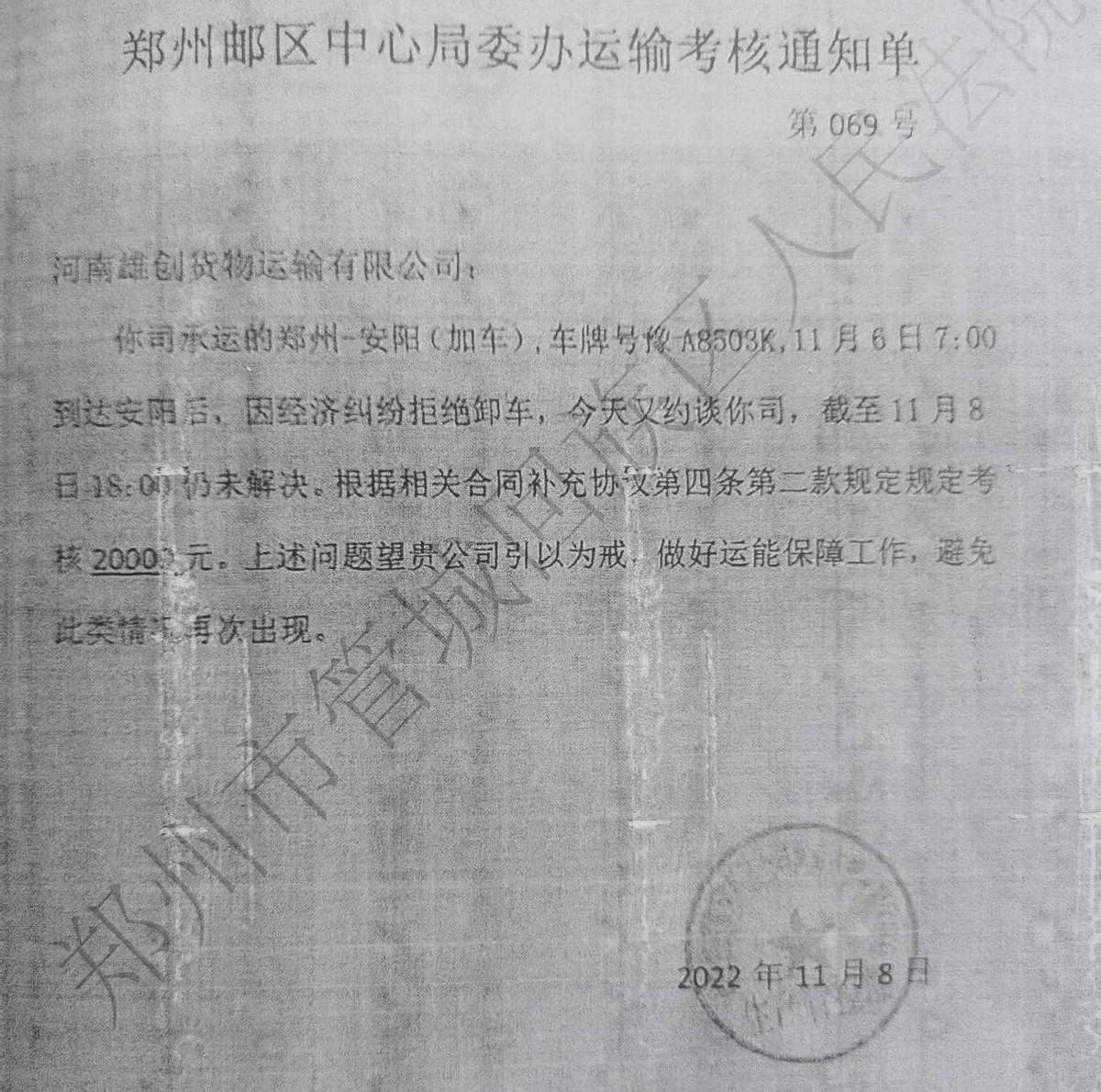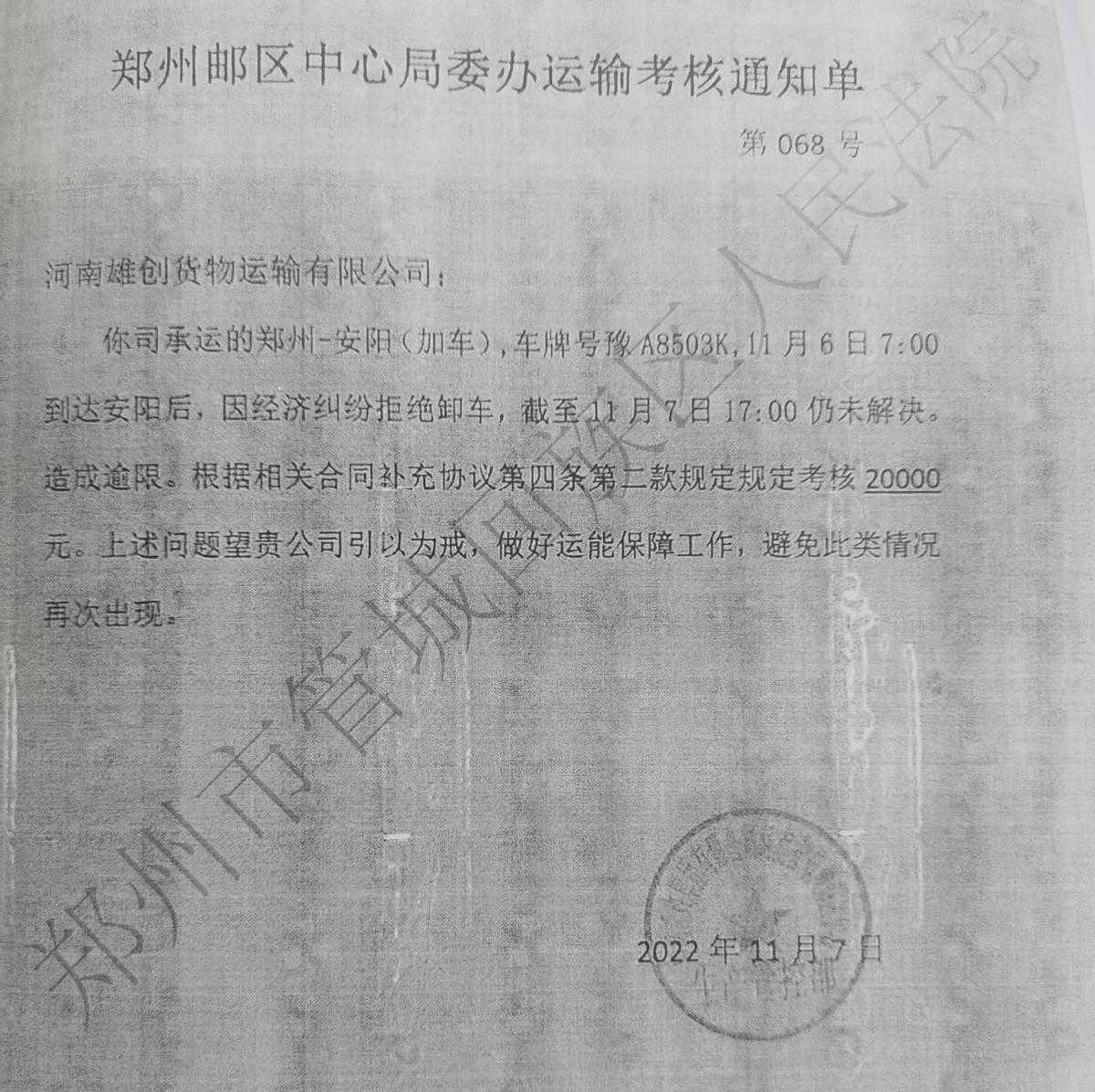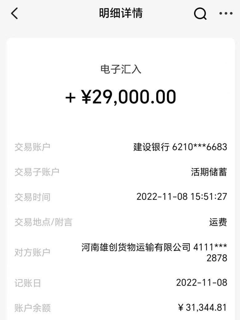 “因为在软通供应链上吃过亏,我对按期付运费特别在意。”韩书伟说,2022年11月6日,他再次拉了一车货物赶到安阳指定卸货点后,告知雄创货运必须先支付拖欠的运费,然后才能卸货。