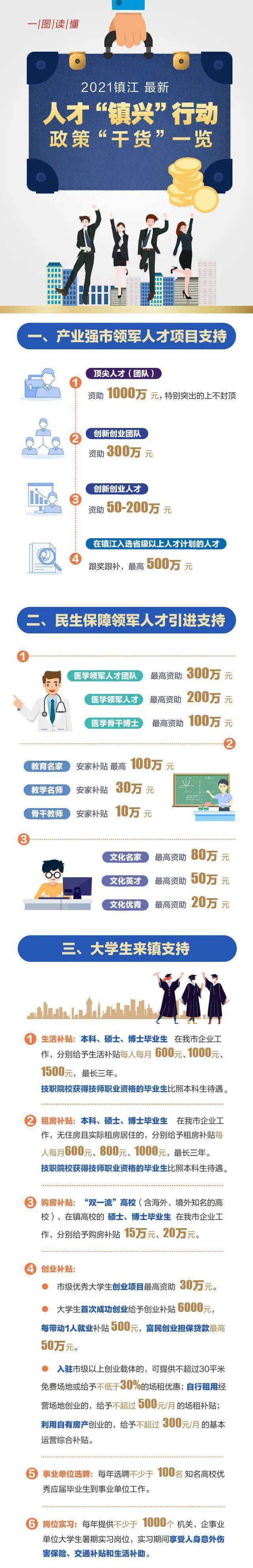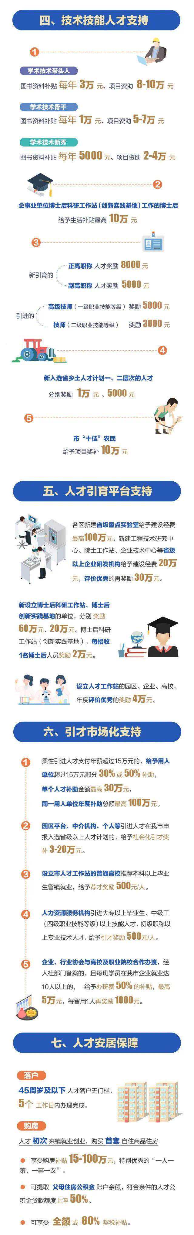 对于顶尖人才,给予项目资助1000万元,特别突出上不封顶;对于创新创业团队和医学领军人才团队,最高项目资助300万元;对于创新创业人才和医学领军人才,最高项目资助200万元;对于医学骨干博士,最高项目资助100万元;对于文化名家、文化英才、文化优青,最高分别给予80万元、50万元、20万元的项目资助;对于教育名家、教学名师、骨干教师,最高分别给予100万元、30万元、10万元的安家补贴;本科及以上毕业生在镇企业工作,三年内享受每月最高2500元的生活和住房补贴。