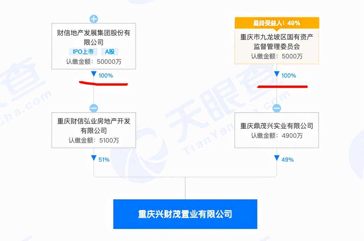 中华网财经从天眼查查询了解到,透过穿透股权关系,重庆兴财茂置业有限公司是财信地产发展集团股份有限公司(A股名称:财信发展”)控股51%的子公司。