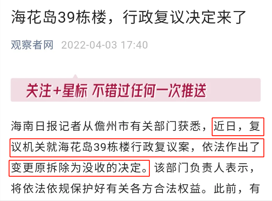 2022年4月3日儋州市政府负责行政复议的部门做出了复议决定,将原来“要求恒大自行拆除”的处理方案改为了“没收”,39栋住宅楼自此不再属于恒大集团。