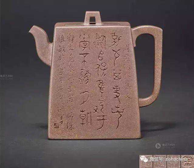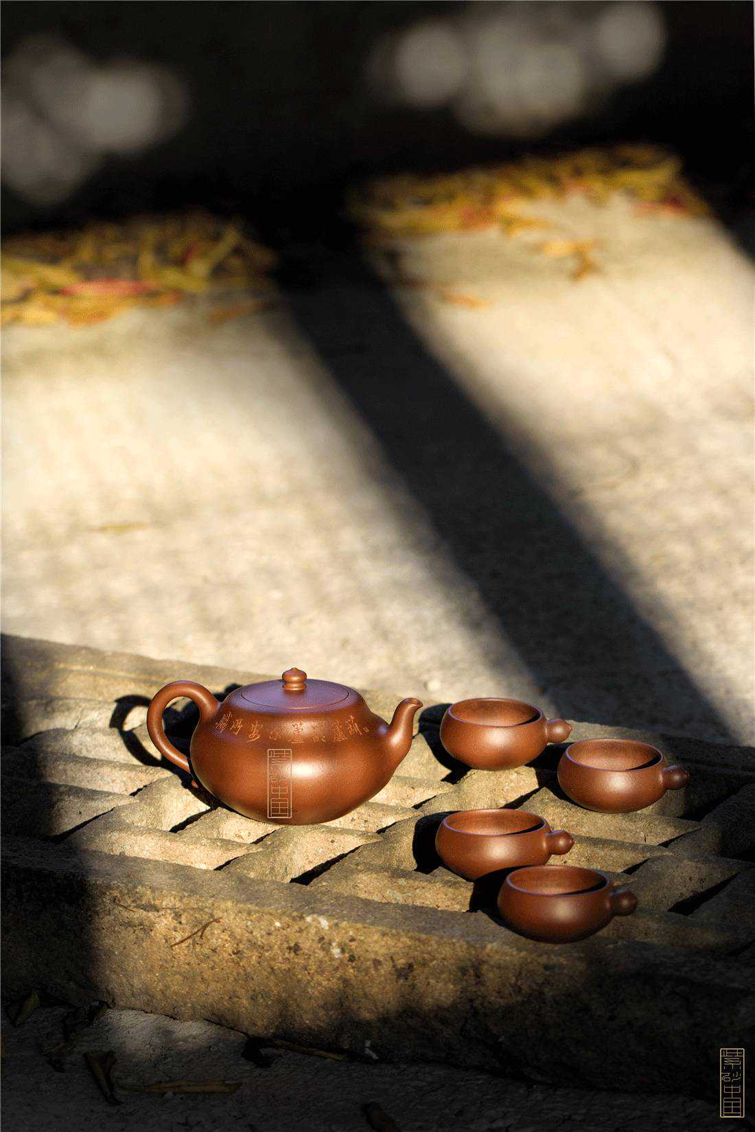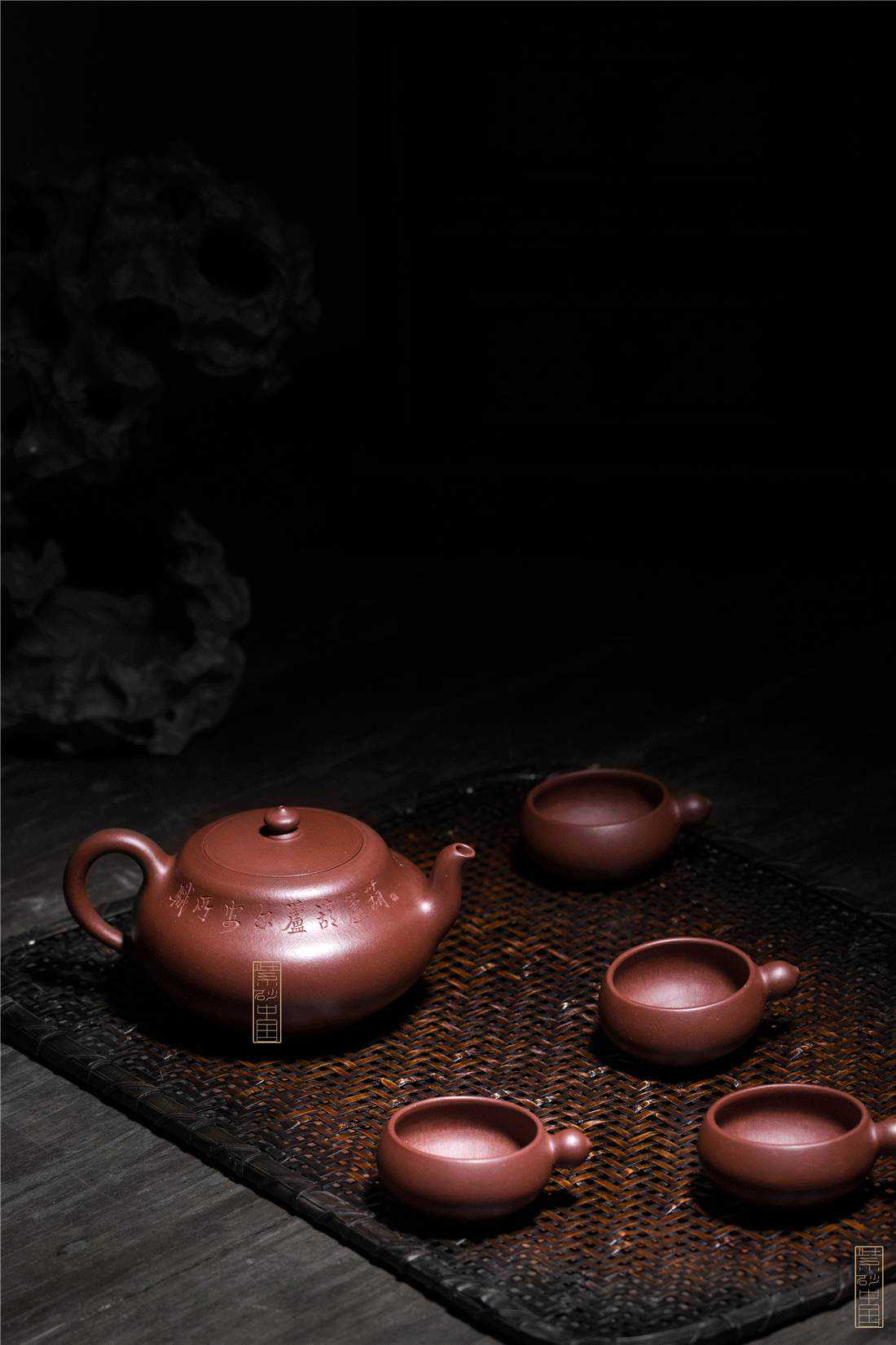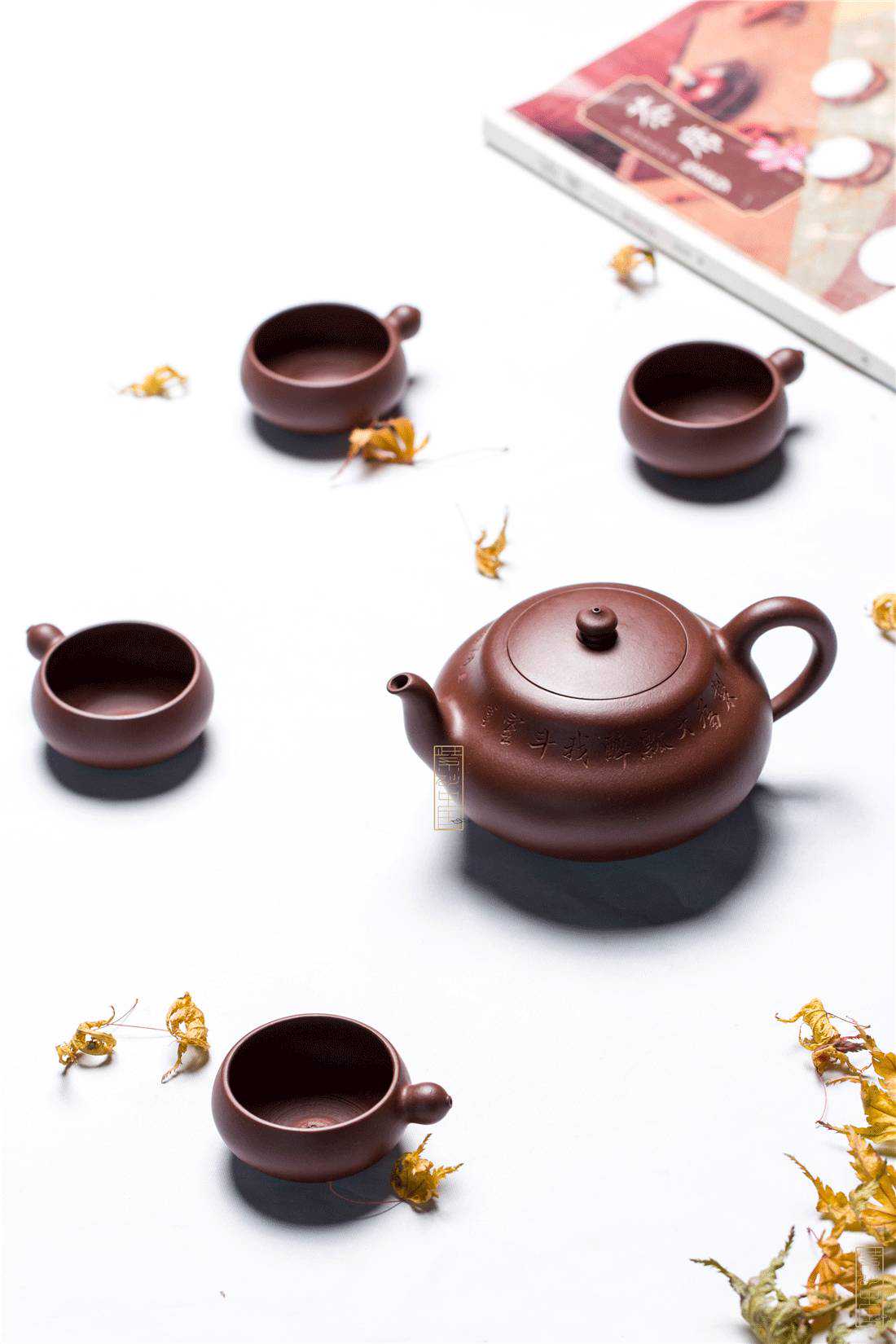 壶附四杯,若众星拱月,简练端正的造型,营造出线面转换的美妙韵律,并且将文人情操与紫砂艺术相结合,精致而富有文士风骨。